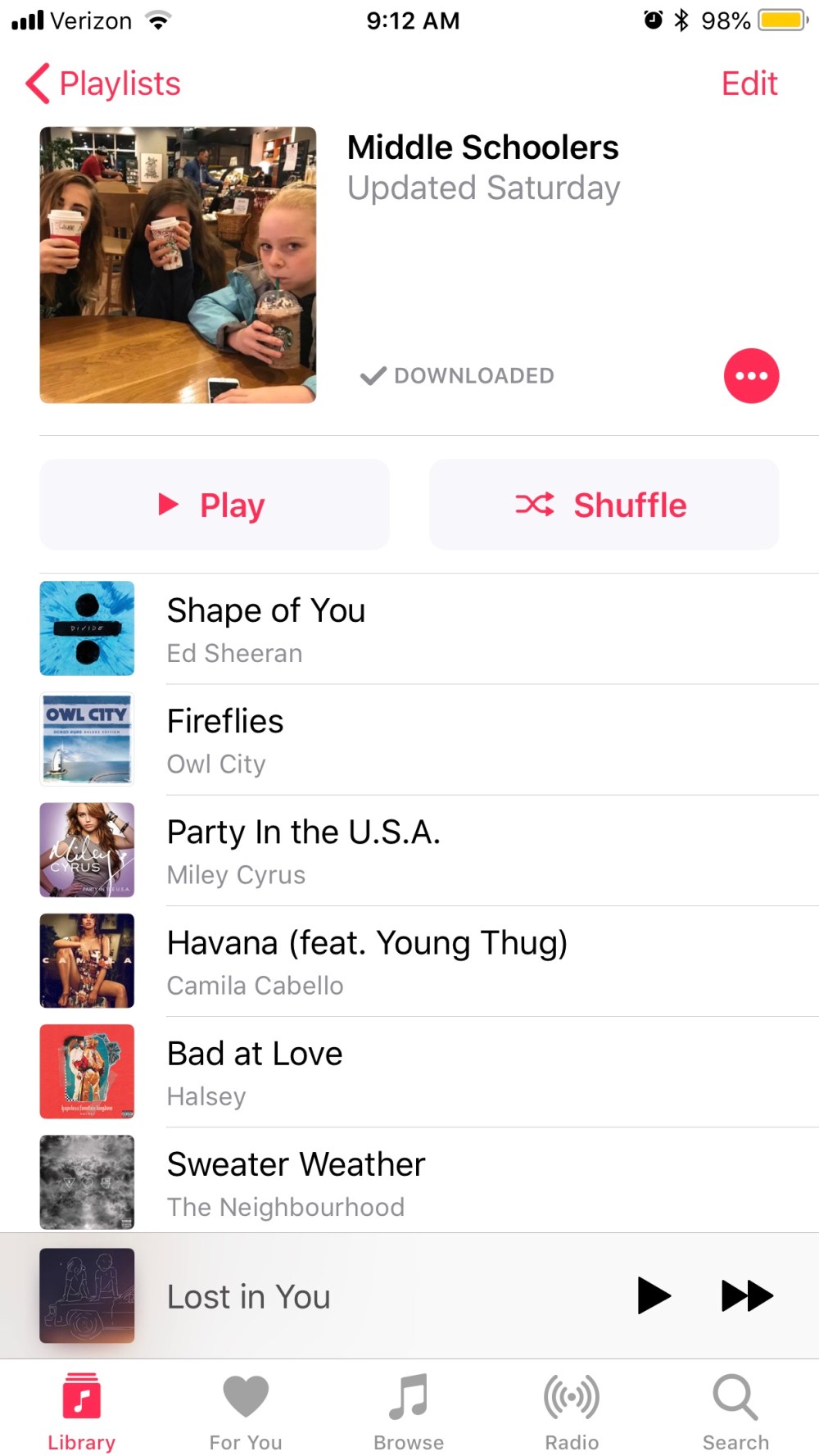 So when I picked up Sara and Zoey with a y, I announced that I was choosing the hot jam for today. Lauren was not pleased. “MOTHER NO! No one wants to hear your music!” I guess she was worried I’d play my Barbra Streisand or Andy Gibb. I had 14 songs which is way too much for the ride to school. Sara’s eyes showed how shocked she was when I played that dreaded 10,000 fireflies song, and they mumbled along under their breath to Shape of You on the way to Starbucks. My treat. I let Lauren choose what to listen to during the last mile to drop-off. Taylor Swift for just a minute, and then Lost in You by Khai Dreams was the very last song they heard as they piled out of the Chariot. It’s by far the most chill, smooth, relaxed song they have played all year. And I think it sums up how I no feel about those Middle Schoolers. I think I might need to get them together once a week during break because I can’t wait for 8th grade. I love you Middle Schoolers! Enjoy your summer!