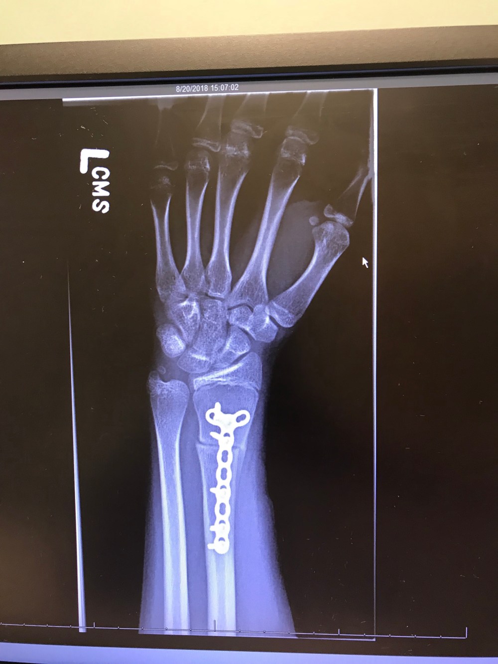 Her doctor referred her to a surgeon who said the after the original injury, the broken radius bone had healed with a curve, and the curved bone was pushing the ulna out of place when Lauren would rotate her wrist. The only way to fix it was to cut the radius and realign the bone properly with a metal plate, and repair the damaged ligaments. Surgery was scheduled July 3. She was in a soft cast to allow swelling up past her elbow, and she was hurting pretty bad for days. You don’t mess around with hydrocodone, but she took that for several days and still hurt anyway. Her hard cast stopped before her elbow and gave her more range of motion than the soft one, and she lived with that until August 20.