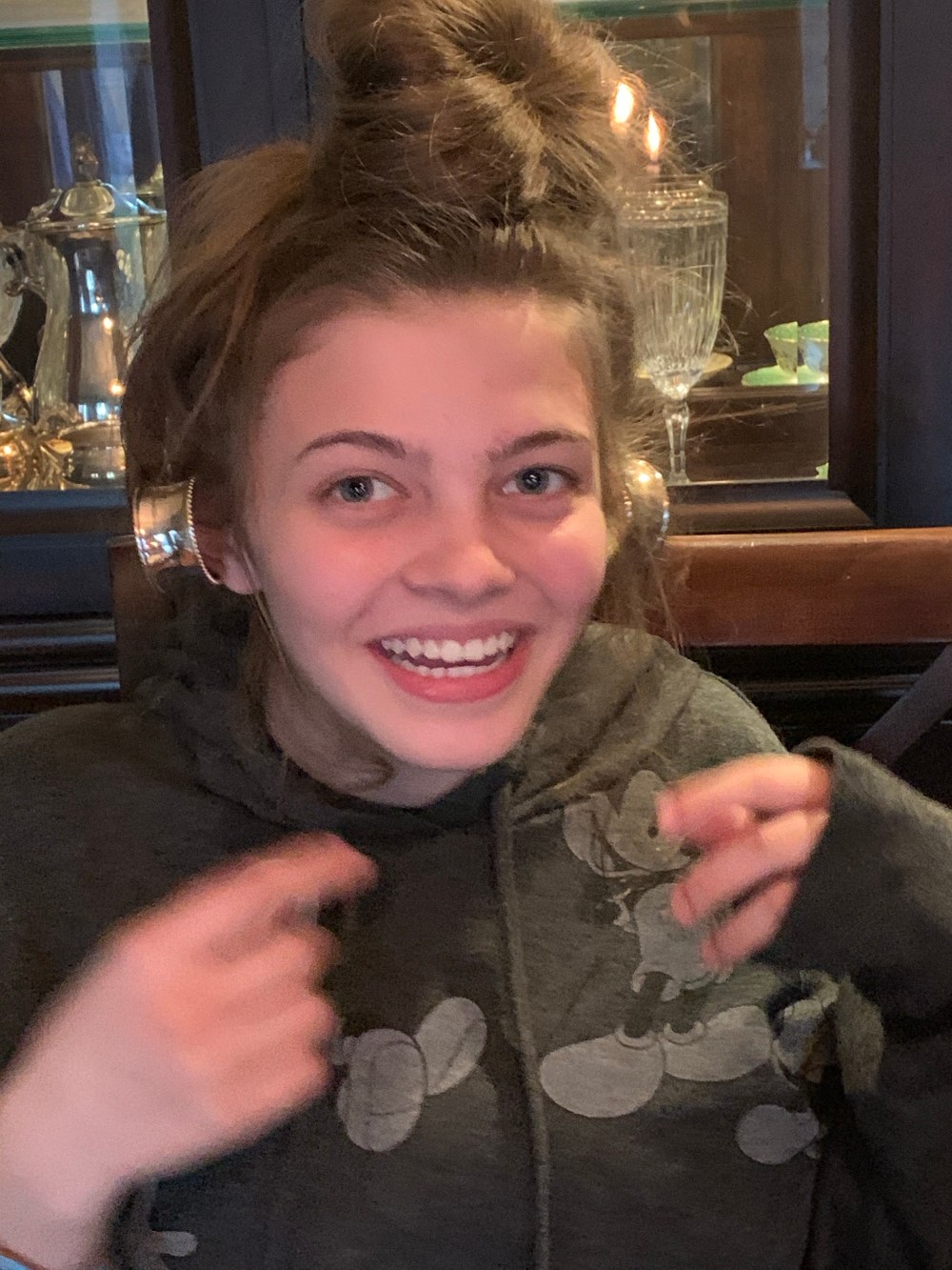 She had her hair straightened for the family pics, but once we got home, she threw her hair into a very messy top-knot. At the dining room table, she took her silver napkin ring and mine, and put them on her ears like hoop earrings, because “whatevah.” I started taking pics of her trying to balance the napkin rings on her ears, but keeping one ring steady on one side made the other ring nearly fall off. We laughed (and snorted), and at least through dinner, she didn’t feel sick anymore. She looked so ridiculous trying balance the rings on her ears, and I said to her “your hair looks so pretty!” I wasn’t lying; she’s always pretty. But she knew I was teasing, and she laughed and snorted more.