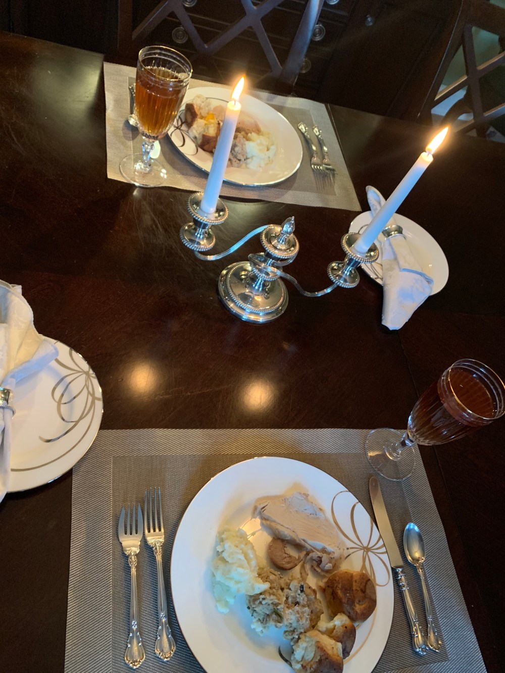 Thanksgiving dinner plans had to be adjusted to accommodate a sick one. We were supposed to go to Paul’s mom’s house Thursday to eat dinner after family pics at Old Salem. I wouldn’t want Emily around anyone while she’s sick with coughing a fever, but Paul’s mom’s cancer has her compromised. I took Em for pics, then she and I left and ate at home by ourselves.