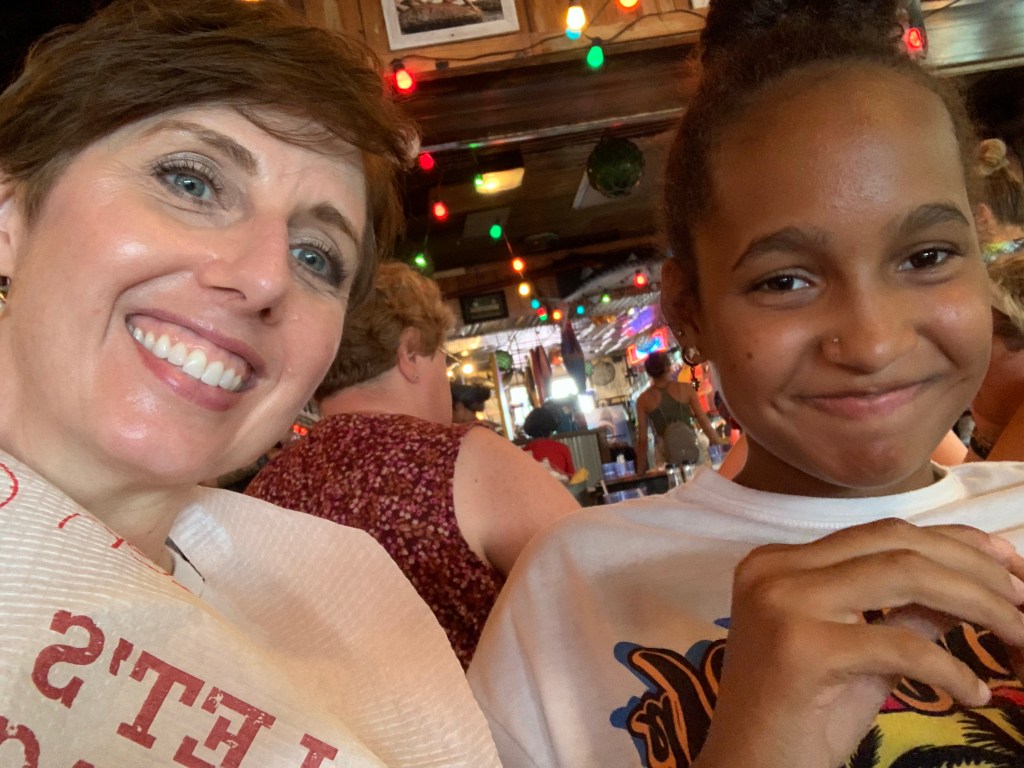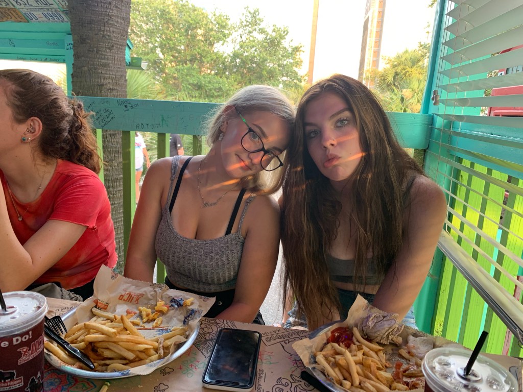 We’ve got 2 newbies with us this year. Emily’s friend Kenzi is quiet, and I’m not sure what she thinks of us yet. She says she’s having fun, but I’m waiting for her personality to really come through. I’m hoping she’ll cut loose if I can get her on the water slide. She’s a fan of the chicken fingers but she branched out and tried the chicken quesadilla at Margaritaville just like me. I like her for liking what I like, and I really like her for giving me the pico and guacamole she didn’t want. Kenzi is a sweet girl who seems strangely familiar like an old friend getting reacquainted but maybe a little hesitant to jump right in. It’s noon, so of course she and Emily are still laying around the house while the rest of us are at the water. And speaking of Oh Emily, I’ll probably not capture a full-face pic of her this week. But Grace was able to get video evidence of her sneakiness last night when the Reclusive Brooding Teen Americanus tricked her dad into holding his hand out so she could plop a dead fish in his wary hand. My texting nickname for Kenzi and Emily is the Beach Buddies, and it’s nice to see their friendship taking shape this week. They need supervision, but a little independence at the same time. And it’s nice to know they can be trusted to walk down to the beach and the waterpark without having to hover over them.