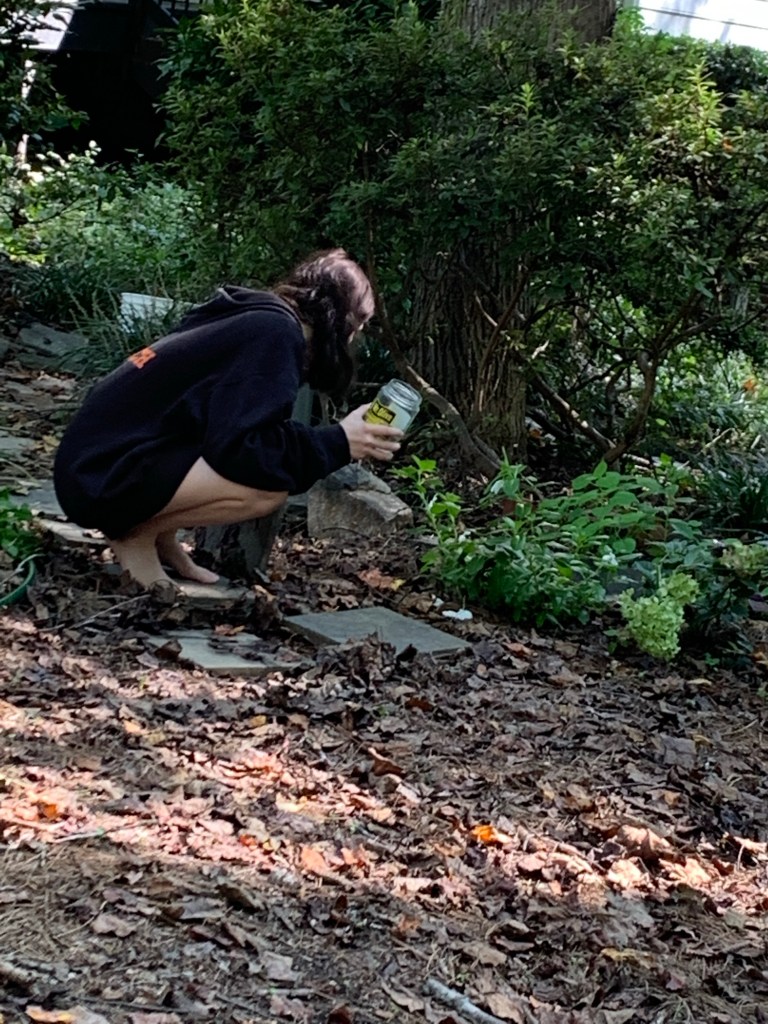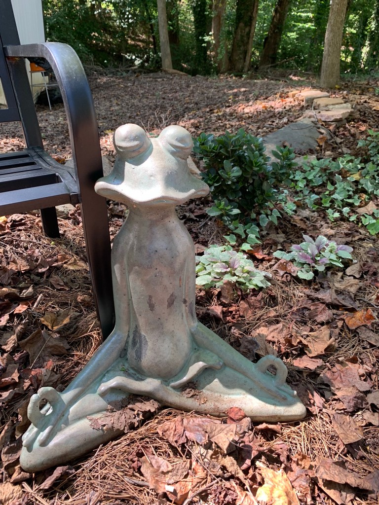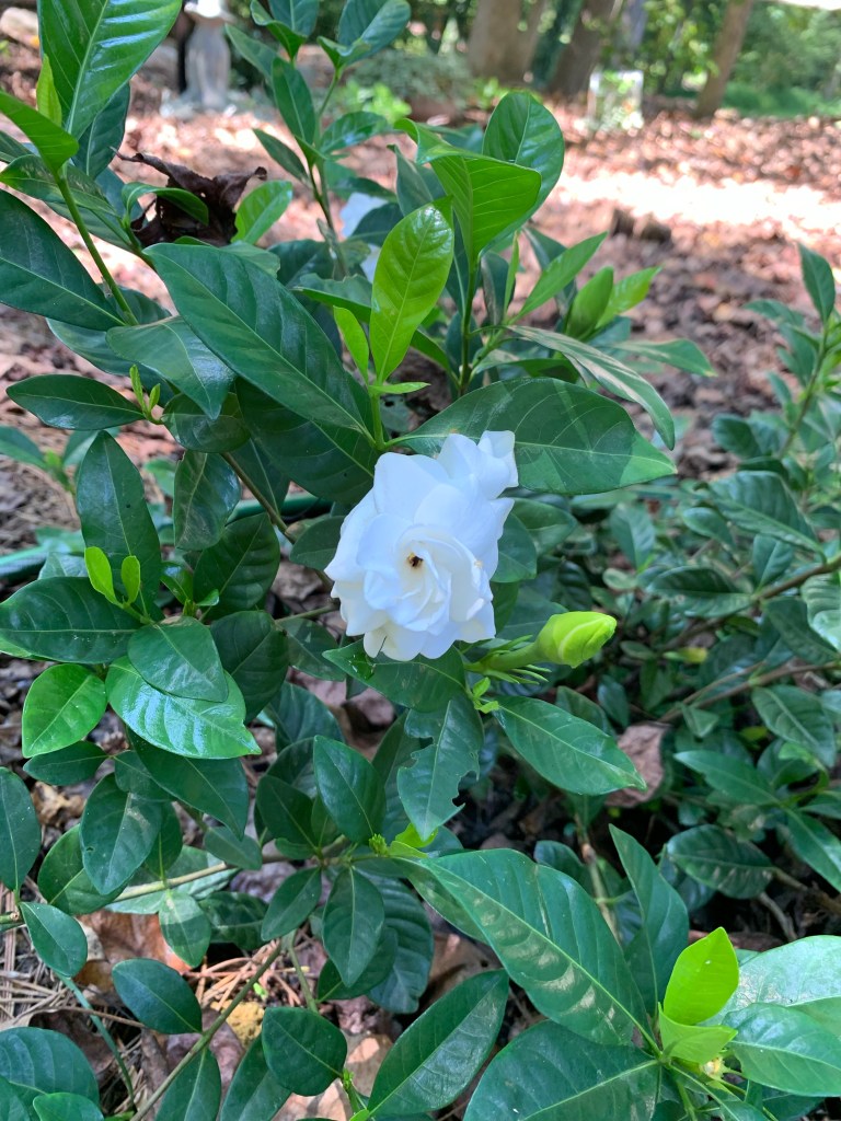 NC is fickle. It was stifling hot and sticky a few days ago, and now it’s cool enough to be outside. In some ways, it’s chillier and frostier inside my house than it is outside. I weeded the Garden of Dappled Light yesterday. The garden was supposed to be a project for Emily and me, but she hasn’t helped much. It was just an empty space nestled between the storage unit and the yard surrounded by a tall canopy of trees, and my plan has been to plant things that would catch the light coming through the leaves. Moonlight gardens like this are planted to show off whites and silvers and grays and blues whose hues stand out at twilight, or as I have planned, during the day in the dappled light beneath the tree branches. Angel Wing Caladium is the star in my garden right now, and it’s doing great next to the bird bath. I’ve moved my Zen meditating frog statue over here because he calms me. I’m hoping my 2 white hydrangeas will really pop next season. White Vinca, Lemon Balm, Portaluca, Japanese Spindletree, Big Leaf Periwinkle, Hair-awn Muhly Grass, Bugleweed, Creeping Jenny, Hosta, Miner’s Lettuce, Woodland Stonecrop, and Spotted Laurel. But my favorite is my Mother’s Day Gardenia. Her perfumed little self was the first thing I planted in this garden. She’s bloomed a few times since May, and I noticed Thursday that she was wearing 3 blooms. One was wilted and falling to pieces. Same Gardenia. Same. And how appropriate.