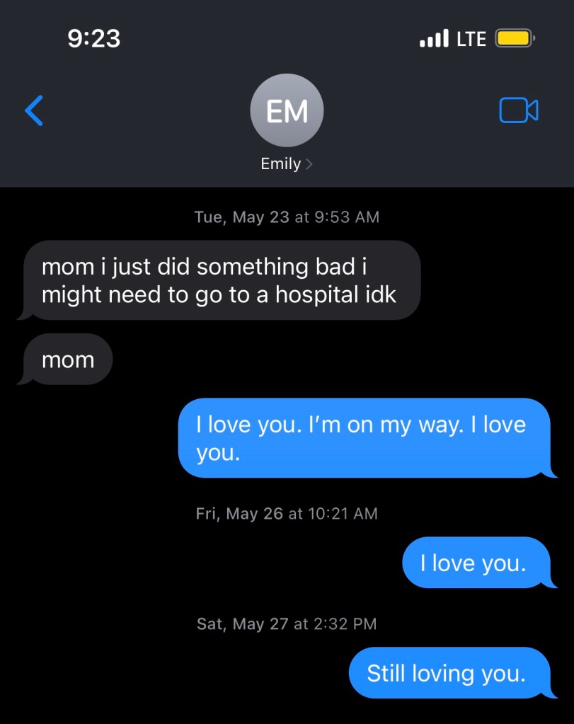 We were all there with Emily. Bec, Paul, me, Grace, Harry, Eli, Lauren, and Gavin. It was hard and precious and gut wrenching. I spent the two nights with her in her private room before she was sent to psych, and Paul would go back to the house. He was the one who found her note. Just to me. He didn’t find a note to whom it may concern. Just to me.